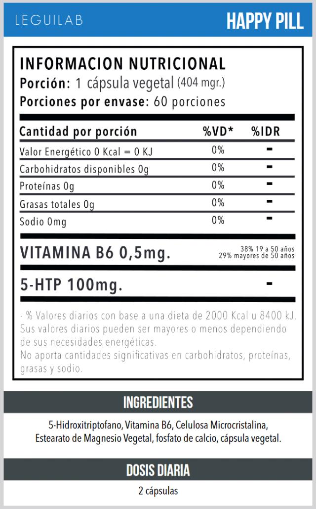 Happy Pill es la combinación de 5HTP más Vitamina B6. El 5-HTP (5-htp, esa es en realidad la abreviación del nombre científico 5-hidroxi-triptófano.es una sustancia que se encuentra naturalmente en las semillas de la planta Griffonia Simplicifolia originaria de países de África Occidental. El 5 HTP es un nutriente precursor de la Serotonina, 40 millones de células cerebrales son influenciadas directa e indirectamente por este neurotransmisor. Niveles bajos de Serotonina están asociados con depresión, ansiedad, insomnio, ganancia de peso en grasa, dificultad para aprender y recordar. Happy Pill® te ayuda a obtener los niveles óptimos de Serotonina para mejorar tu calidad de vida.