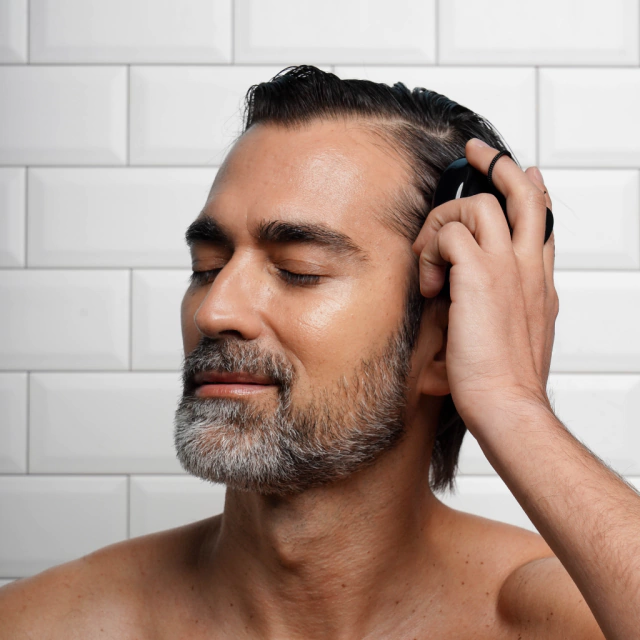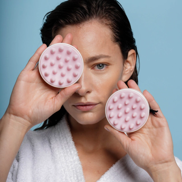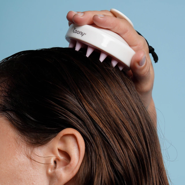 Aplicar shampoo, aceite de masaje o tratamiento como de costumbre y distribuir por todo el cuero cabelludo y el cabello. Mientras sostiene el masajeador en la palma de la mano, presione suavemente las puntas de silicona contra el cuero cabelludo con una presión media y masajee. Repita en todas las áreas del cuero cabelludo. El masajeador se puede utilizar en cabello húmedo o seco, con o sin producto. Evite realizar grandes movimientos circulares para evitar enredos.