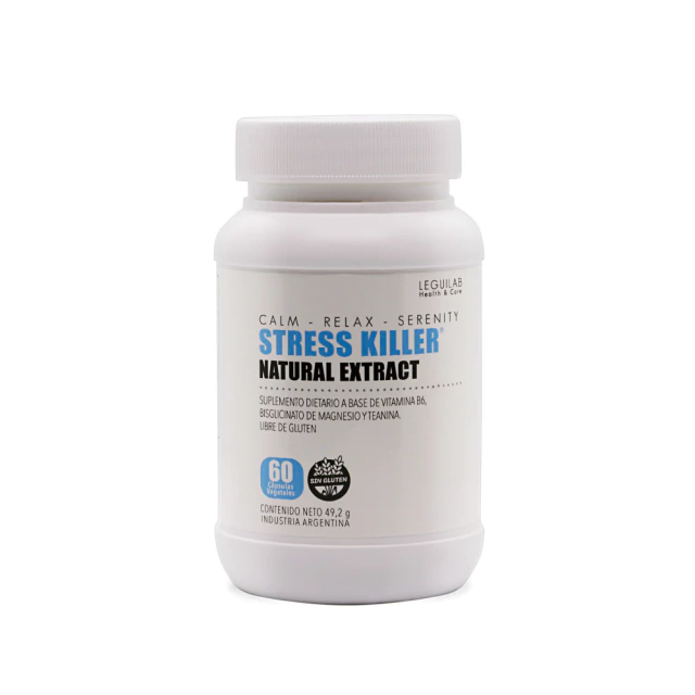 Stress Killer® ofrece una fuente de alta biodisponibilidad de Magnesio y L-Teanina. El Magnesio y la Glicina contenidas en el Bisglicinato de Magnesio contribuyen a lograr un buen balance mental y emocional mientras que la L-Teanina, estimula las ondas alfas del cerebro promoviendo la calma y un estado de serenidad. Stress Killer® te ayuda a estar más tranquilo y relajado! Te recomendamos tomar una a dos cápsulas diarias por el plazo de 2 meses ya que el efecto puede evidenciarse luego del primer mes de consumo.
